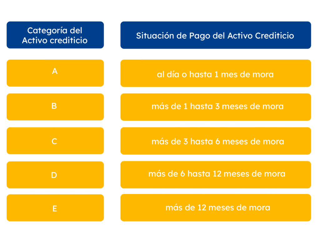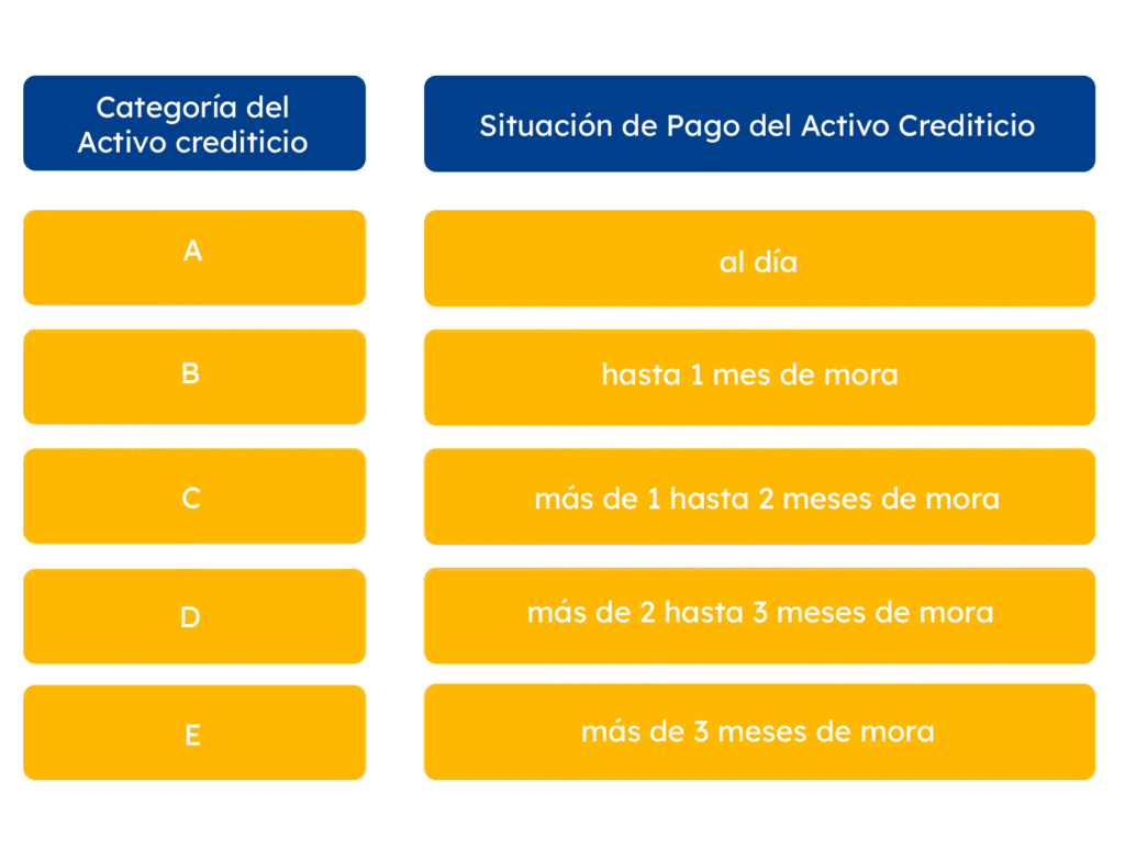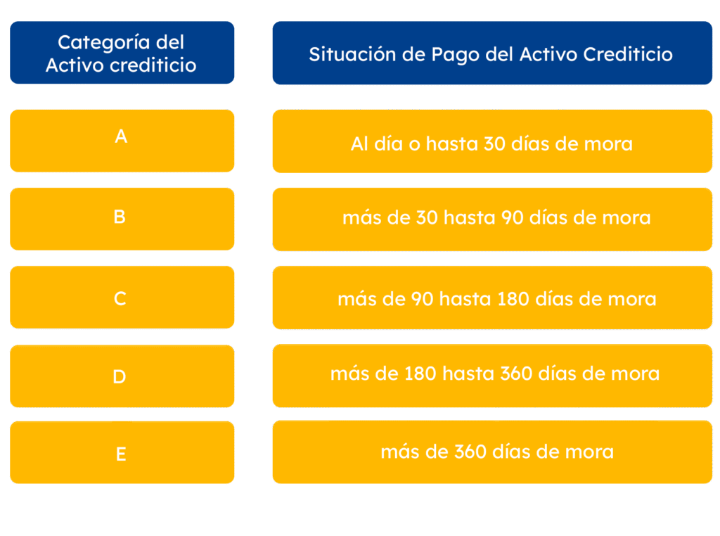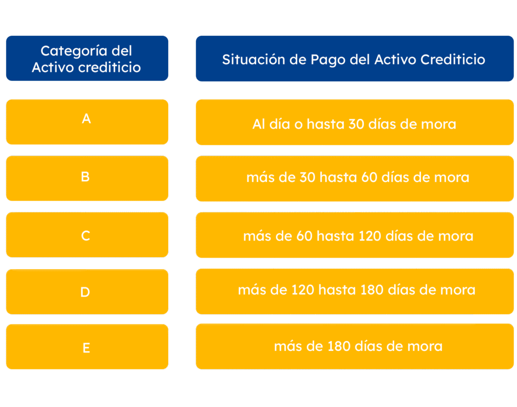 La clasificación de activos crediticios de deudores empresariales mayores podrá consultarlo en los artículos 29 y 30 del Reglamento para la Administración del Riesgo de Crédito, Resolución JM-93-2005. A partir del 1 de enero de 2023, entra en vigencia el nuevo Reglamento para la Administración del Riesgo de Crédito (Resolución JM-47-2022), el cual establece la siguiente clasificación: