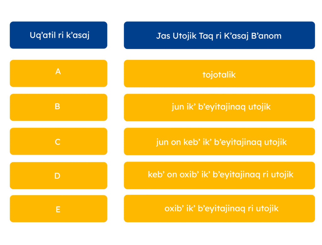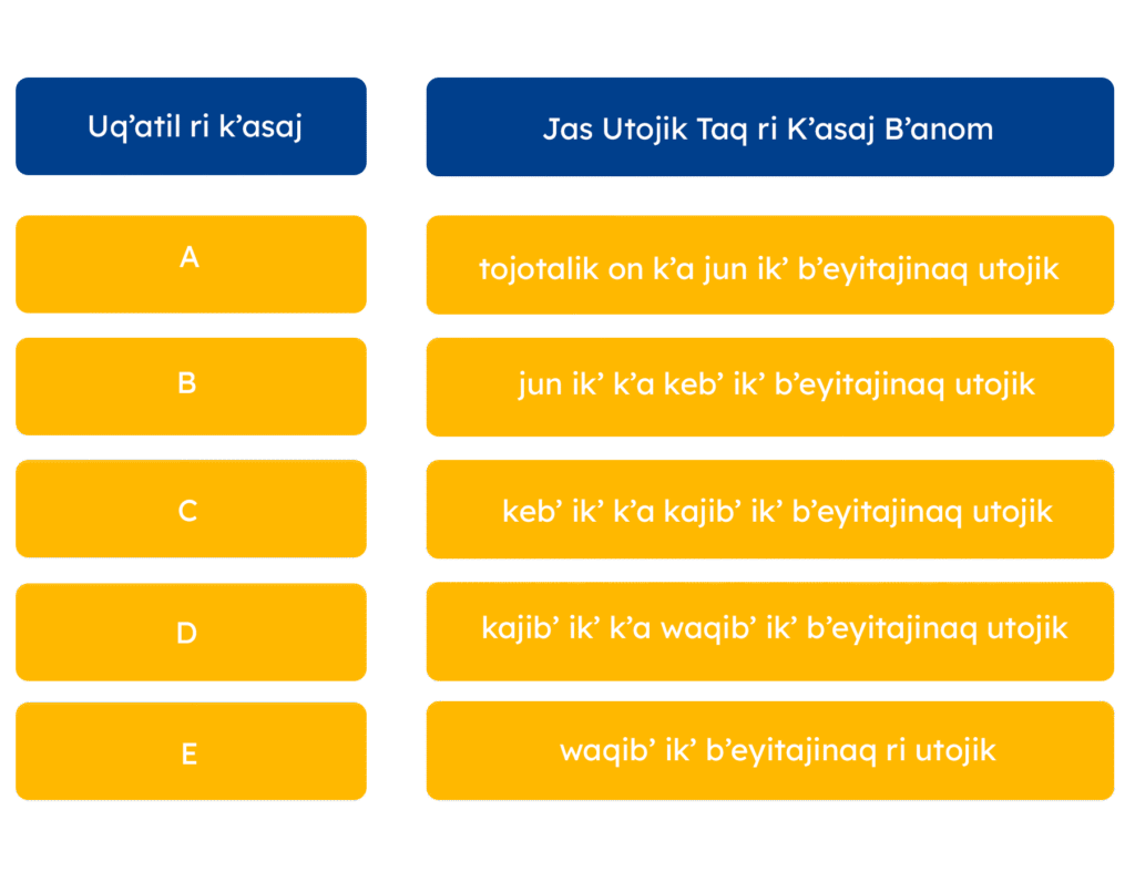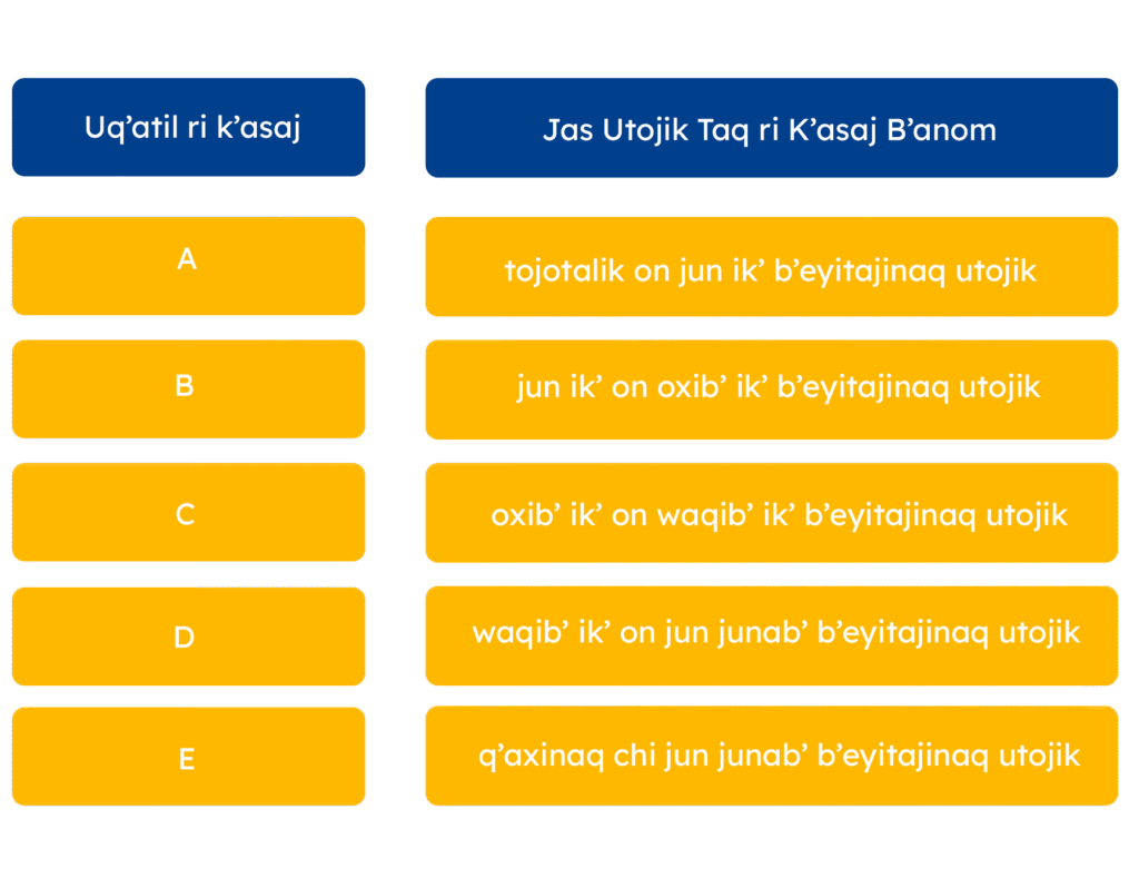 Ri jalajoj taq uwach ri k’asaj e k’o na kech taq ri nima’q taq wokaj kuya’o ksolix rij pa taq ri q’ataj 29 xuquje’ 30 rech ri utaqanib’al rech ri Ilom chakunem rech we k’o K’axk’olil pa uwi’ ri K’asaj, Taqanik JM-93-2005. Kmaj ukojik pa ri nab’e q’ij rech ri ik’ enero rech ri junab’ 2023, kmajitaj ukojik ri k’ak’ Taqanik rech Rilik ri Chakunem we k’o K’ax kuya ri K’asaj (Taqanik JM-47-2022), are taq wa’ ri jalajoj taq uwach kub’ij: