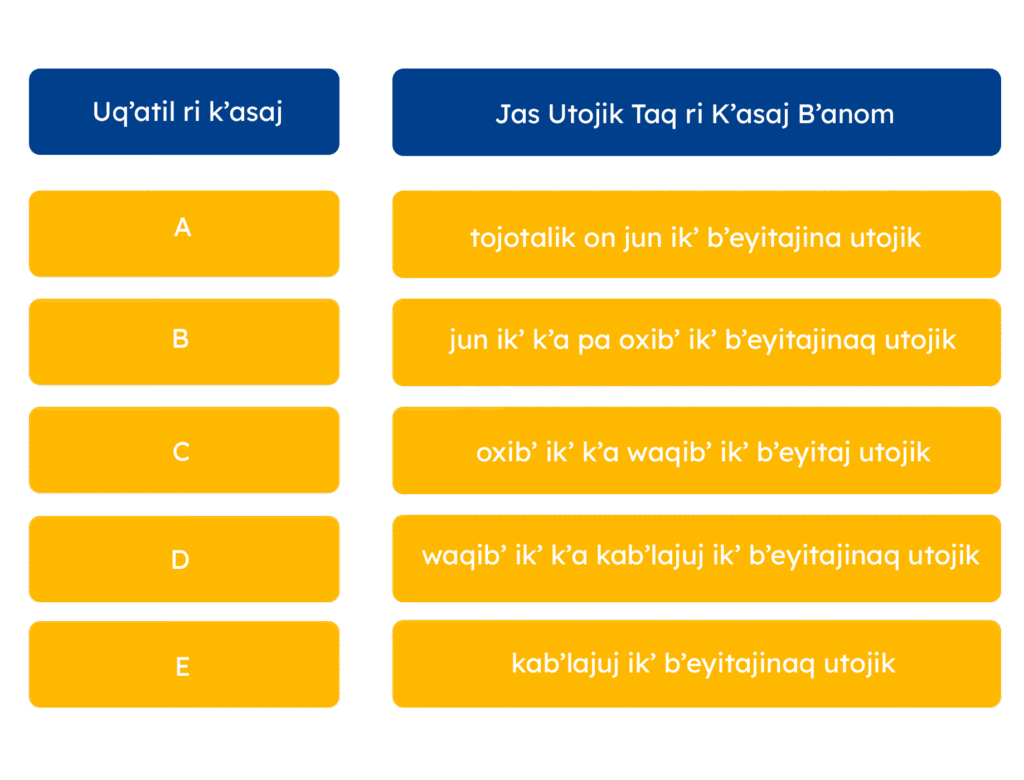 Ri b’ixikil jachom chech ri winaq man kesax ta utzijol, chi upam k’o ub’i ri utojik ri k’asaj ub’anom ri winaq rech ri job’ junab’ kanoq jampa’ k’ut xuta ri uwuj.